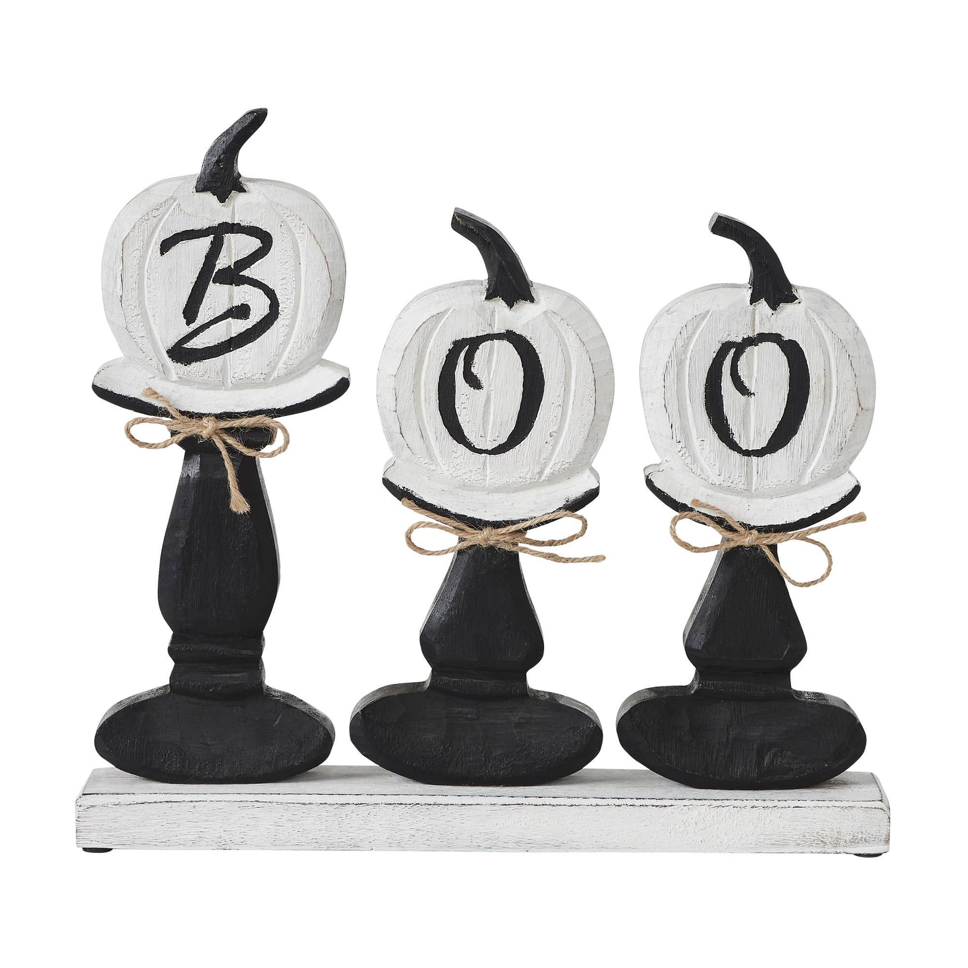 Bring a playful and rustic touch to your Halloween decor with the VHC Brands BOO Pumpkins Wooden Table Sign. This 12.5x13.5 inch figurine features three white pumpkins, each carved with one letter of the word BOO. Each pumpkin sits on a black pedestal with a twine bow, and all three pedestals are securely attached to a single white base, making it easy to move around your home and display it in various settings. Crafted from durable tropical wood, this wooden table sign brings a charming, primitive look to your fall and Halloween decor. The rustic black and white color palette, along with the carved and painted graphics, gives it a timeless, vintage-inspired feel that complements farmhouse or country-style interiors.