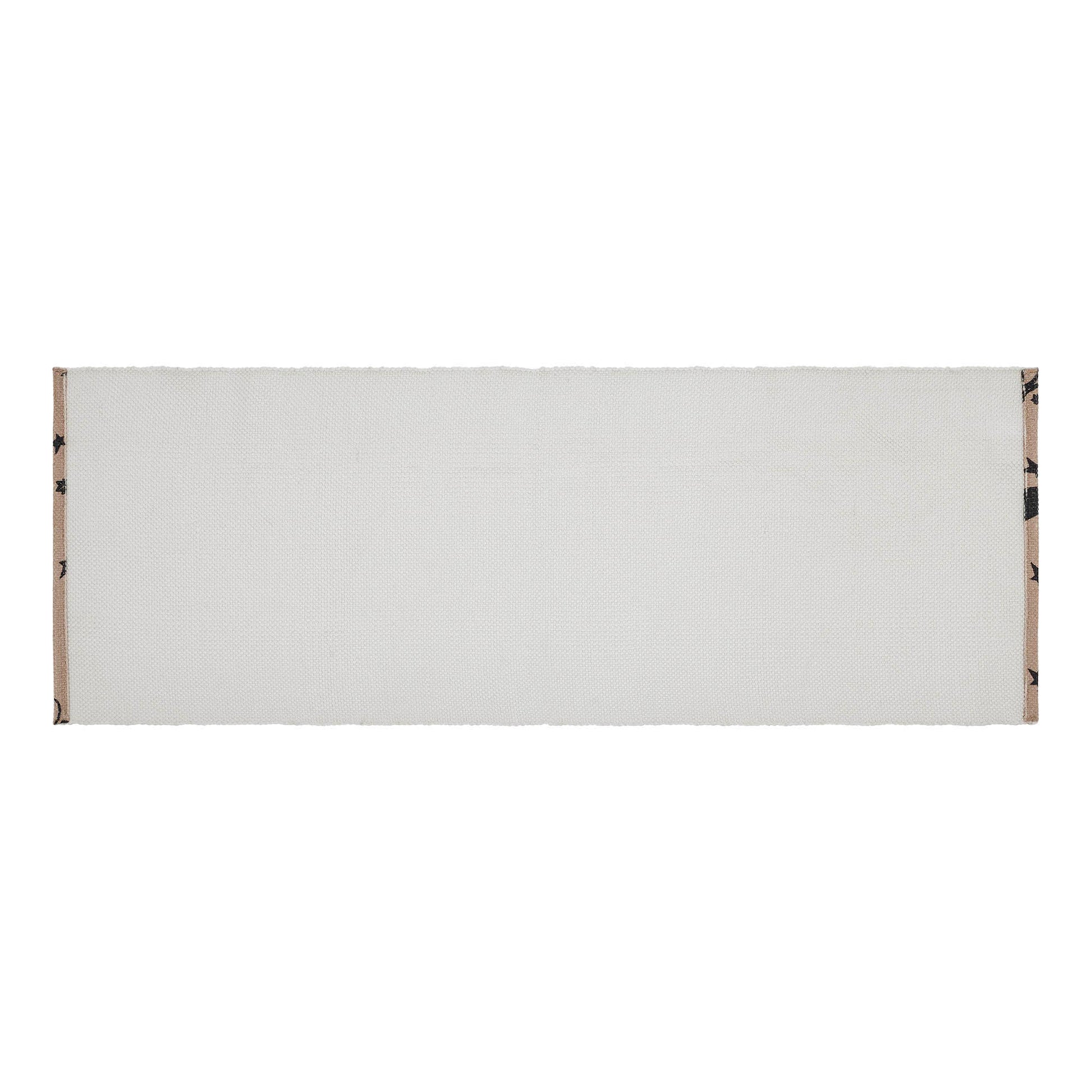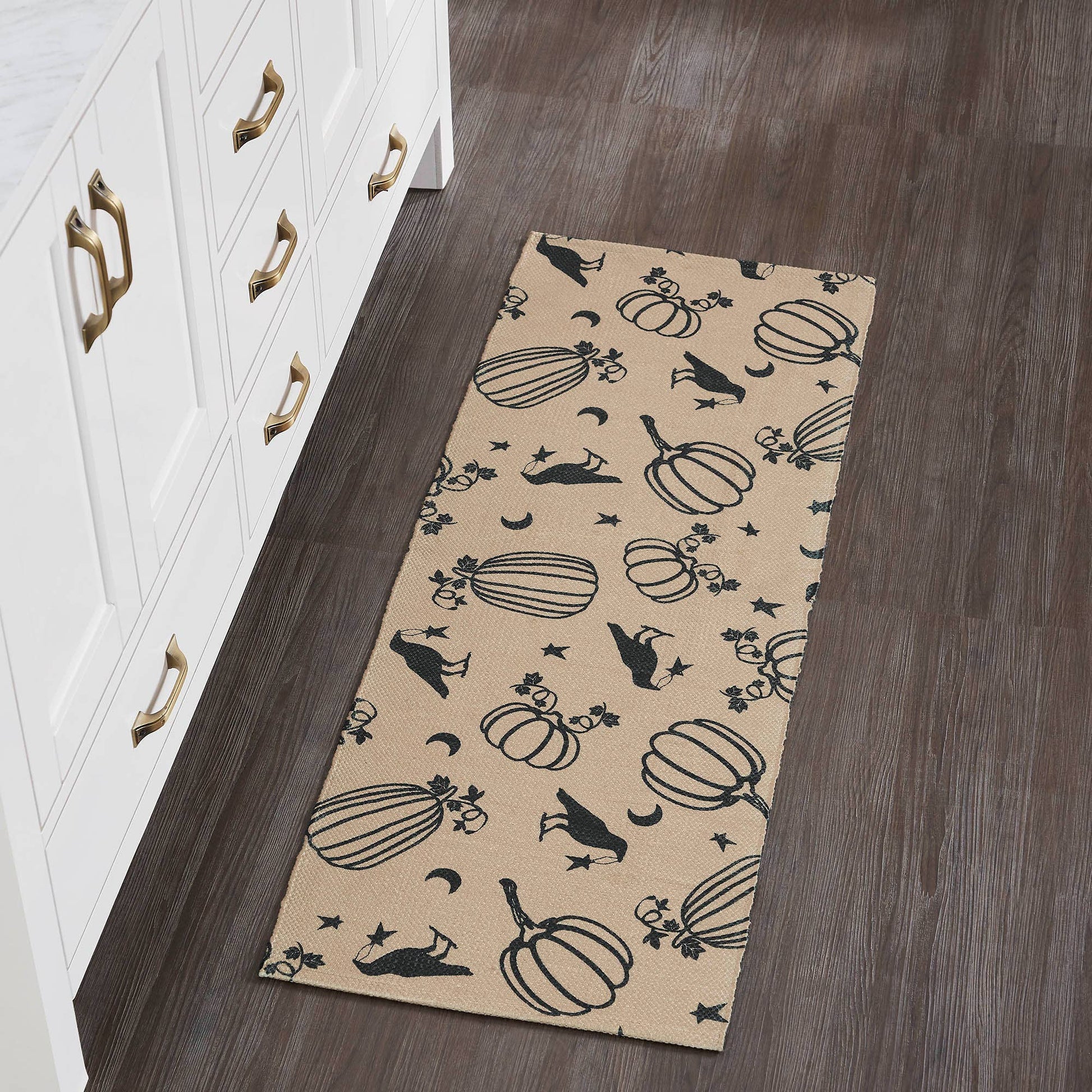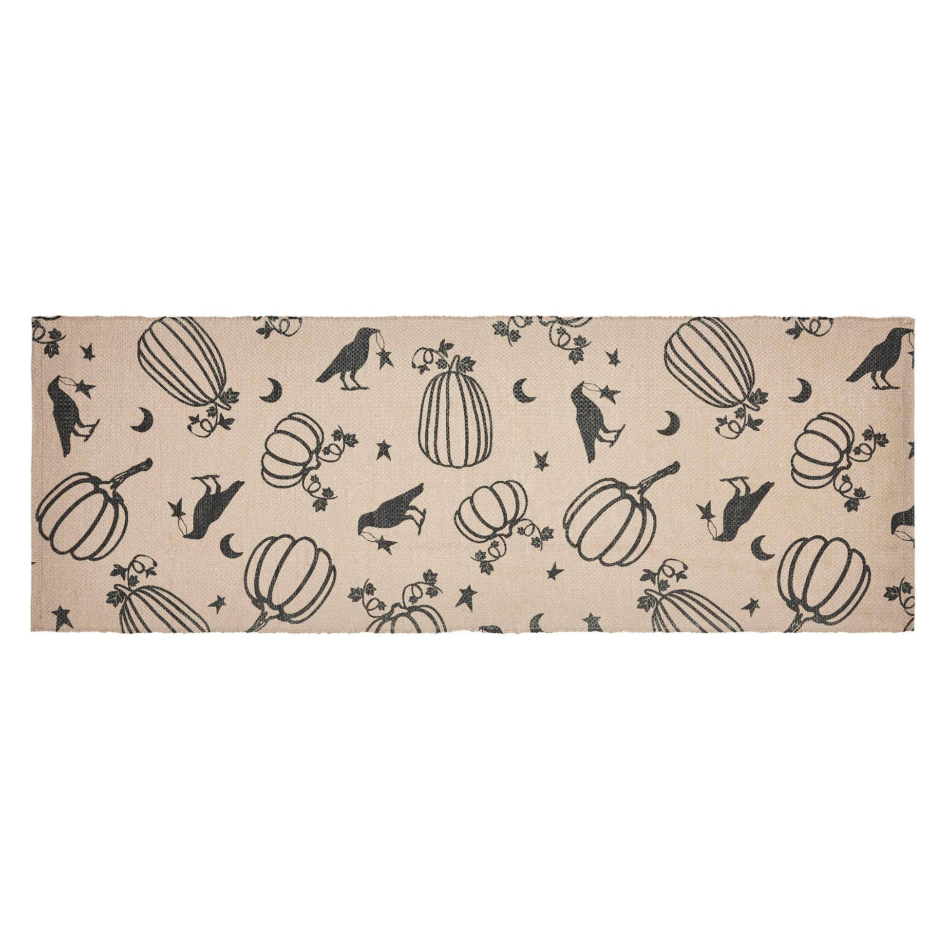Welcome friends and family with modern fall style. The Raven Harvest Indoor/Outdoor Rug measures 17x48 inches and is constructed with recycled plastic for a textured and water-resistant surface that is perfect for entryways and kitchens. The deep tan fabric is accented with a caviar black pattern featuring printed pumpkins, ravens and stars with crescent moons for a festive fall design. Includes: 1 x Rug Care Instructions: Hand Wash, Lay Flat to Dry Material: 100% Recycled Plastic (PET)